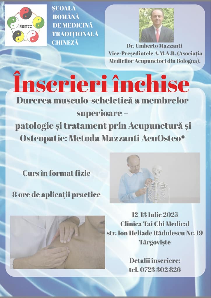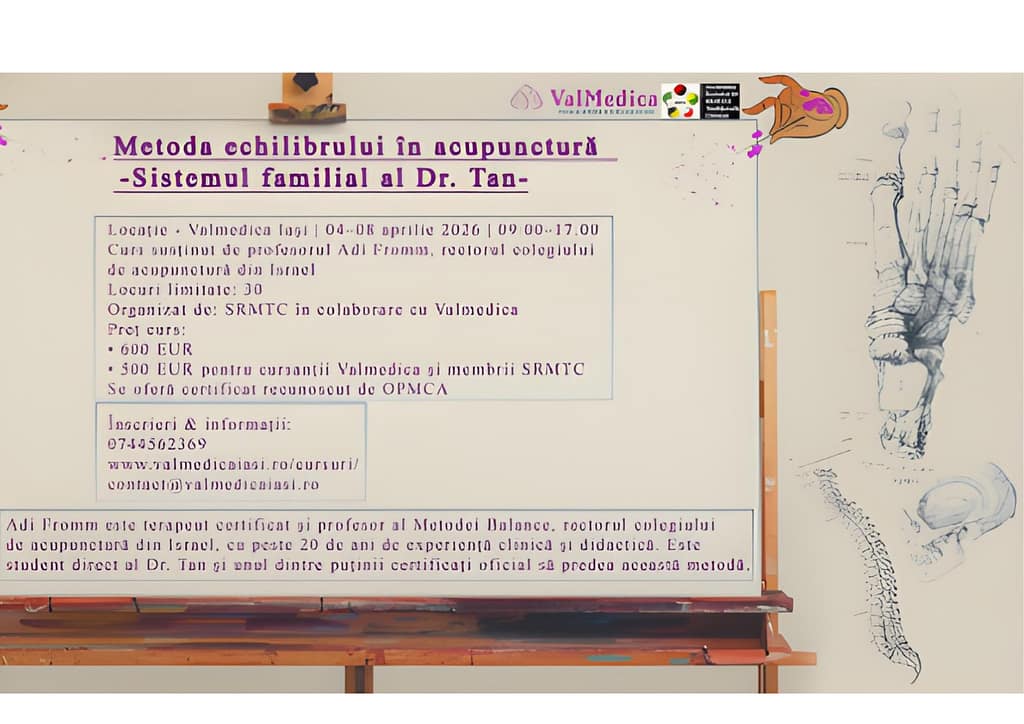 📍 Locație: ValMedica Iași📅 Perioada: 04–08 aprilie 2026 | 09:00–17:00👨🏫 Curs susținut de profesorul Adi Fromm, reprezentant al colegiului de acupunctură din Israel👥 Locuri limitate: 30🤝 Organizatori: SRMTC și ValMedica 💰 Preț curs:• 600 EUR• 500 EUR pentru cursanții ValMedica și membrii SRMTC 🎓 Se oferă certificat recunoscut de OPMCA Adi Fromm este terapeut certificat […]
